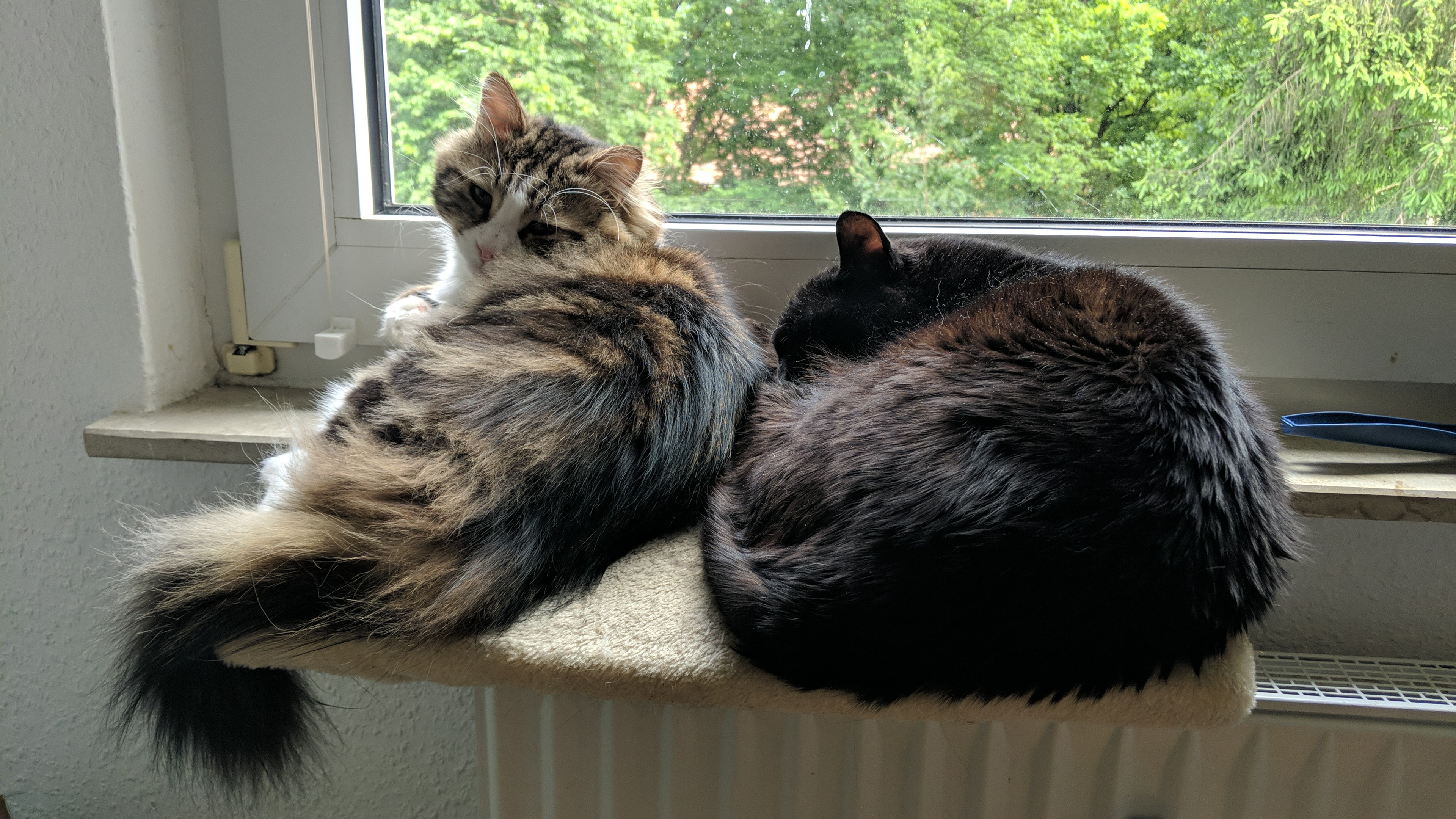 Ich vermute, Bebish lag da zuerst und Joshi hat sich dazugequetscht. Aber scheint Bebish ja nicht zu stören ...😲