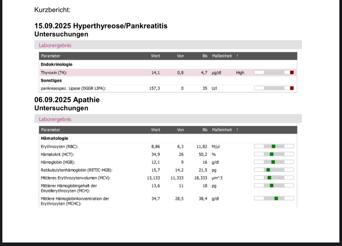 Also Montag wieder zum Tierarzt. Es wurde ein Ultraschall vom Bauchraum gemacht . Und Schilddrüsen und Bauchspeicheldrüsenwerte gemacht . Bingo beides erhöht .